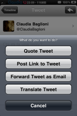 - Timeline, per visualizzare i tweet postati da voi e dalle persone che seguite; effettuando un tap prolungato su di un qualsiasi tweet si aprirà un menu dal quale potrete scegliere se replicare, ritwittare o aggiungere ai preferiti il messaggio. Entrando, invece, nella schermata di un determinato tweet e cliccando sull’icona posta in basso a destra, avrete la possibilità di effettuare un retweet, un RT, di tradurre il tweet o di inoltrarlo via mail. I vostri tweet e quelli in cui siete stati menzionati avranno un colore diverso rispetto agli altri, in modo tale da esser facilmente individuati.